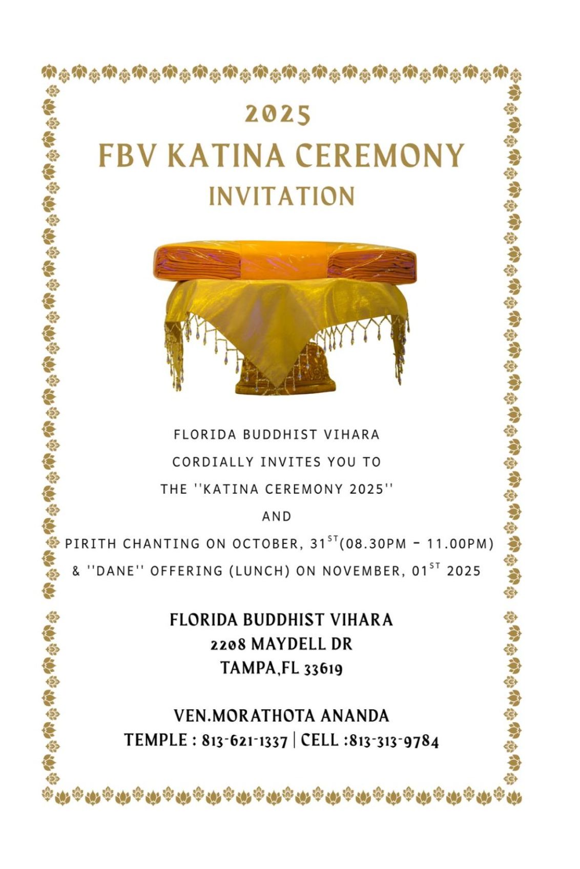 We would like to share merits with all who contributed to the successfully concluded Kathina Ceremony for 2025 at the Florida Buddhist Vihara. Moreover, we would like to bless upon all the Mahasangha who participated in the Katina ceremony, sponsors for this year’s Katina ceremony, those who dedicated a night sleeplessly to sew the Katina robe, sponsors for the Pirikaras and Dana, all contributors and organizers of the Dhaham pasela children’s pola, those who cleaned up the temple prior to the event and once the event was concluded, and to all of you who participated in person and through the online event.